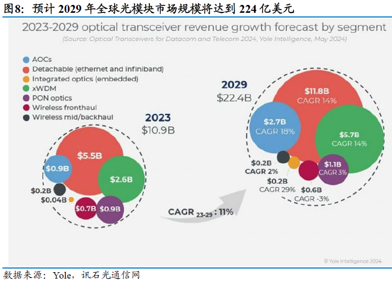 综合电信和数据中心等下游市场来看,由于英伟达的大量人工智能基础设施订单和数据中心网络升级到800G,2024 年全球光模块市场的收入从 2023 年的109 亿美元同比增长27%到138 亿美元,未来随着由于云服务运营商和国家电信运营商对 400G 以上高数据速率模块的高需求,预计该市场到 2029 年将达到 224 亿美元。
