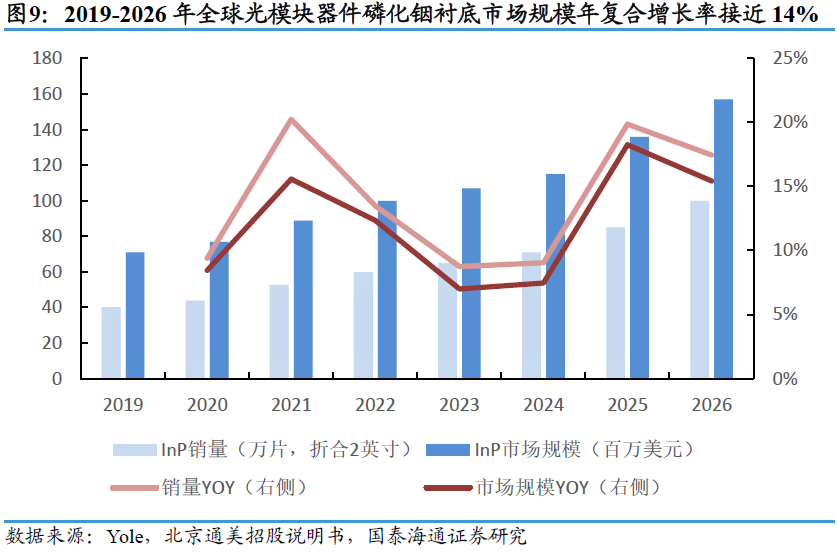 总体而言,磷化铟衬底在光通信领域的应用不仅限于当前的高速传输系统,更将在未来的信息基础设施建设中持续发挥关键作用。根据 Yole 统计显示,到 2026 年全球光模块器件磷化铟衬底(折合两英寸)预计销量将超过100 万片,2019 年-2026 年复合增长率达 13.94%,2026年全球光模块器件磷化铟衬底预计市场规模将达到 1.57 亿美元,2019-2026 年复合增长率达 13.94%。