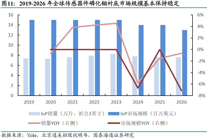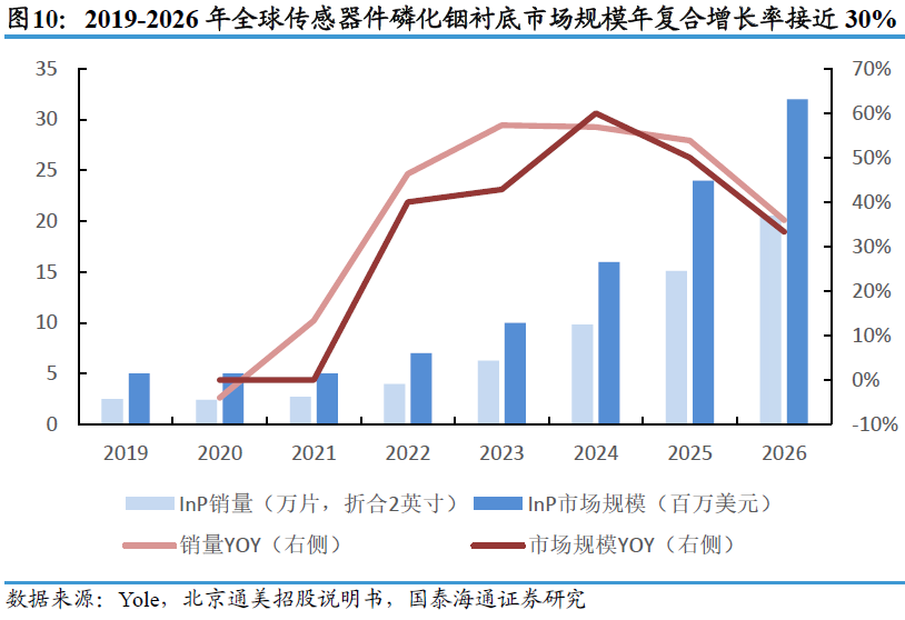根据Yole 预测,2026 年应用于传感器件领域的磷化铟衬底(折合二英寸)销量将达到 20.54 万片,2019-2026 年年均复合增长率为 35.14%,2026 年应用于传感器件领域的磷化铟衬底市场规模将达到3200 万美元,2019-2026 年年均复合增长率为30.37%。