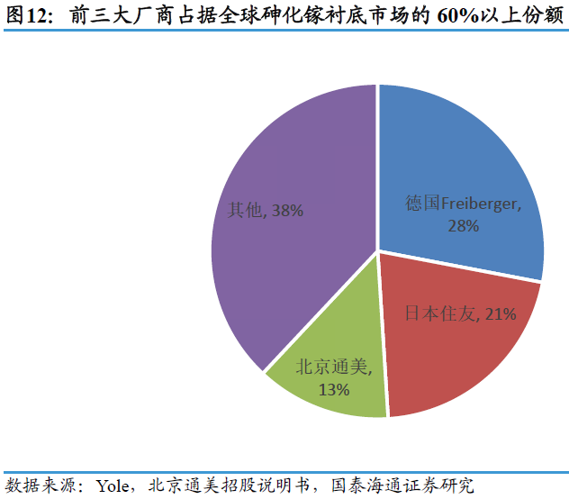 由于行业整体规模较小及非标准化程度较高,全球砷化镓衬底市场集中度较高。根据Yole 统计,2019 年全球砷化镓衬底市场主要生产商包括Freiberger、Sumitomo和北京通美,其中Freiberger 占比28%、Sumitomo 占比 21%、北京通美占比13%。目前国内涉及砷化镓衬底业务的公司较少,除北京通美外,广东先导先进材料股份有限公司等公司在生产LED 的砷化镓衬底方面已具备一定规模。目前,主流商用砷化镓衬底直径已从 3 英寸扩展至 6 英寸,部分领先企业正推进 8 英寸晶圆的研发,以满足大规模集成电路制造的需求。