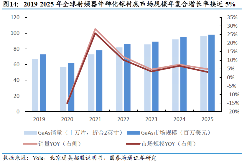 伴随5G通信技术的快速发展与不断推广,5G 基站建设以及 5G 手机的推广将使砷化镓基射频器件稳步增长。根据 Yole 预测,2025 年全球射频器件砷化镓衬底(折合二英寸)市场销量将超 965.70万片,2019-2025年年均复合增长率为6.32%。 2025 年全球射频器件砷 化镓衬底市场规模将超过9800 万美元,2019-2025 年年均复合增长率为5.03%。