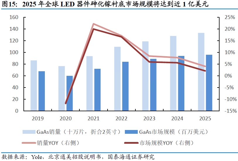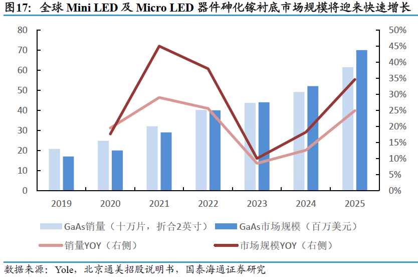 根据Yole 预测,Mini LED 及 Micro LED 器件砷化镓衬底的需求增长迅速,2025 年全球Mini LED 及Micro LED 器件砷化镓衬底(折合二英寸)市场销量将从2019 年的207.90 万片增长至613.80 万片,年复合增长率为 19.77%;2019 年全球Mini LED 及Micro LED 器件砷化镓衬底市场规模约为1700 万美元,预计到2025 年全球砷化镓衬底市场规模将达到 7000 万美元,年复合增长率为 26.60%。