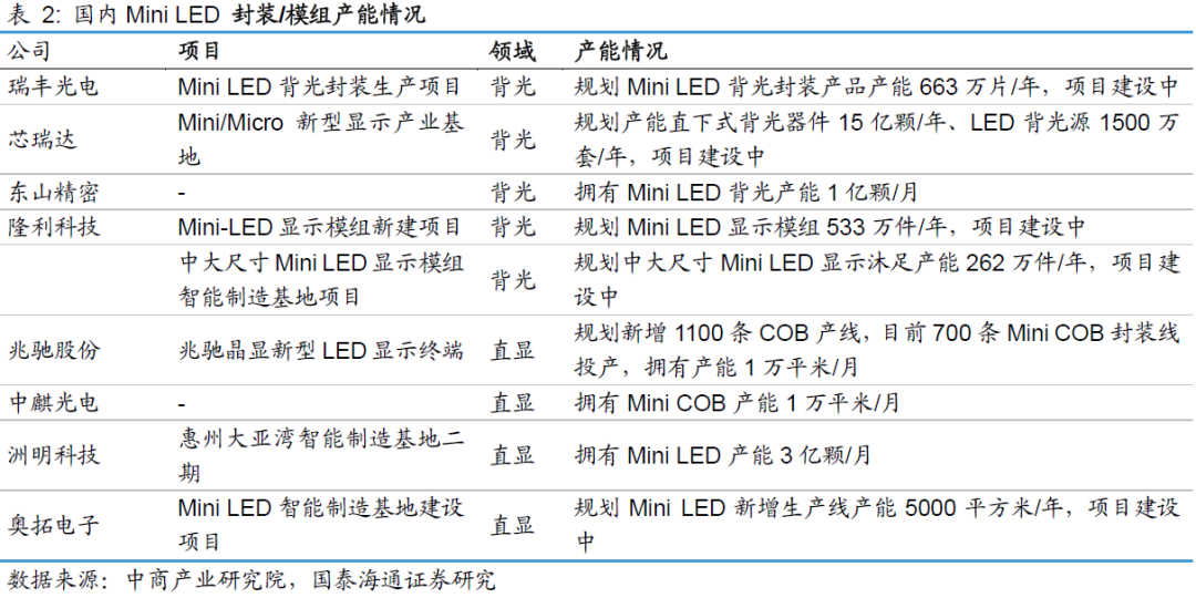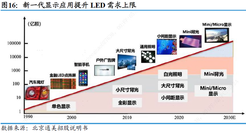 Micro LED 指使用微米发光二极管,即芯片尺寸小于 50μm 的LED 器件作为像素 发光源的高密度LED 阵列显示技术。除显示效果的进一步提升外,Micro LED 技术可解决Mini LED 技术无法适用于小尺寸屏的局限性,未来可广泛应用于手机、平板、手表、AR/VR 设备、笔记本电脑、各尺寸高清电视等应用场景。目前,由于Micro LED 芯片尺寸较小,制造及封测技术难度较高,其规模商业化需要产业链整体配套水平的提高,尚需一定时间。Micro LED 显示技术一旦实现产业化,其对砷化镓衬底的需求将有望呈几何级数增长。