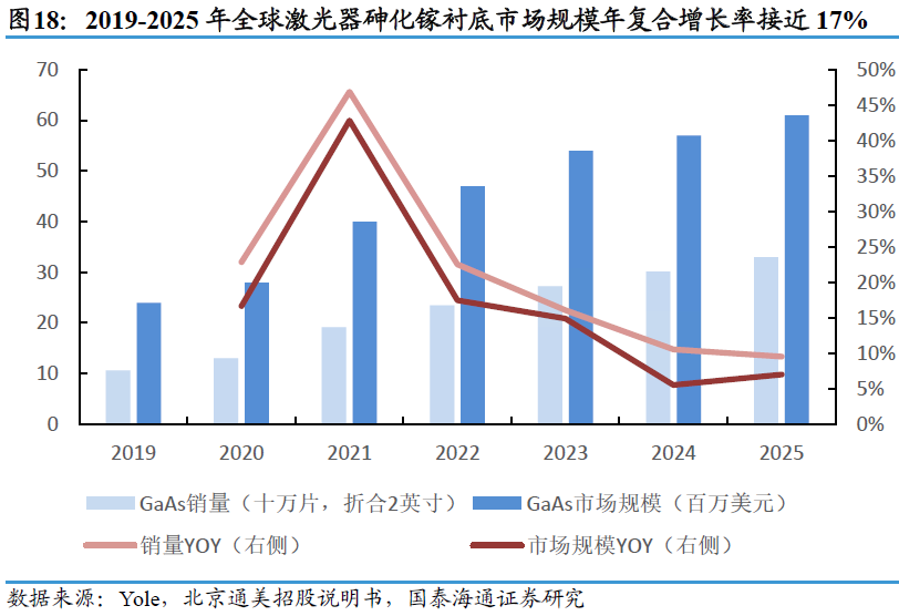 根据 Yole 预测,激光器是砷化镓衬底未来五年最大的应用增长点之一。预计到 2025 年,全球激光器砷化镓衬底(折合二英寸)的市场销量将从 2019 年的106.2 万片增长至330.3 万片,年复合增长率为20.82%;预计到 2025 年,全球激光器砷化镓衬底市场容量将达到 6,100 万美元,年复合增长率为 16.82%。