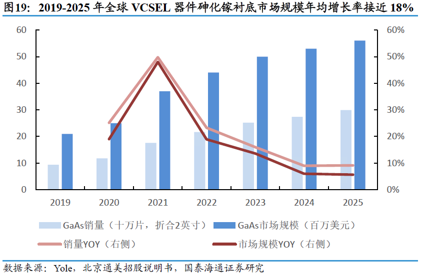 根据 Yole 预测,随着 3D 传感技术在各领域的深度应用,VCSEL市场将持续快速发展,继而加大砷化镓衬底的需求。2019 年,全球VCSEL 器件砷化镓衬底(折合二英寸)销量约为93.89 万片,预计到2025 年将增长至 299.32 万片,年复合增长率达到 21.32%;2019 年全球 VCSEL 器件砷化镓衬底市场规模约为 2100 万美元,预计到 2025 年全球砷化镓衬底市场规模将超过 5600 万美元,年复合增长率为17.76%。