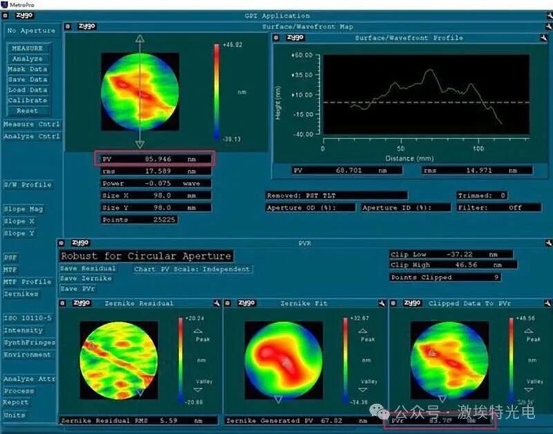 这是评估镜片加工质量的关键,通过干涉仪等高精度设备测量得到,并以一张彩色的“面形误差云图”直观呈现。其中,PV值与RMS值是最常用、最重要的两个“成绩单指标”。